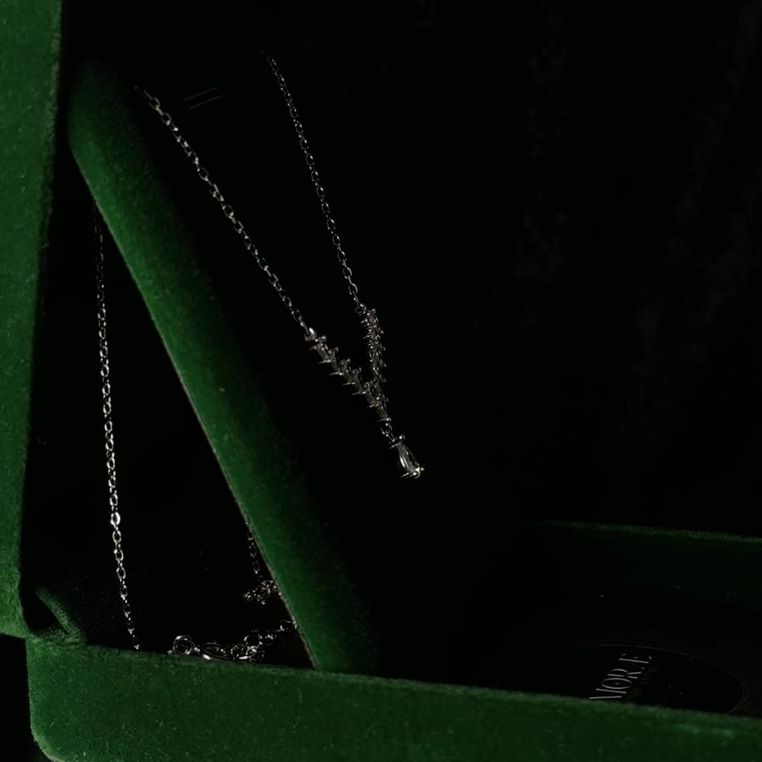 Ce collier en argent massif 925 est orné d'un pendentif en forme de V serti de pierres de zircone cubique taille poire de taille dégradée, se terminant par une goutte de zircone cubique pour une brillance accrue. Confectionné en argent massif 925 et rhodié, il offre un éclat exceptionnel, une grande durabilité et une excellente résistance au ternissement. Sa chaîne légère de 45 cm se pose confortablement au niveau de la clavicule, ce qui en fait un bijou idéal à porter seul ou en superposition.